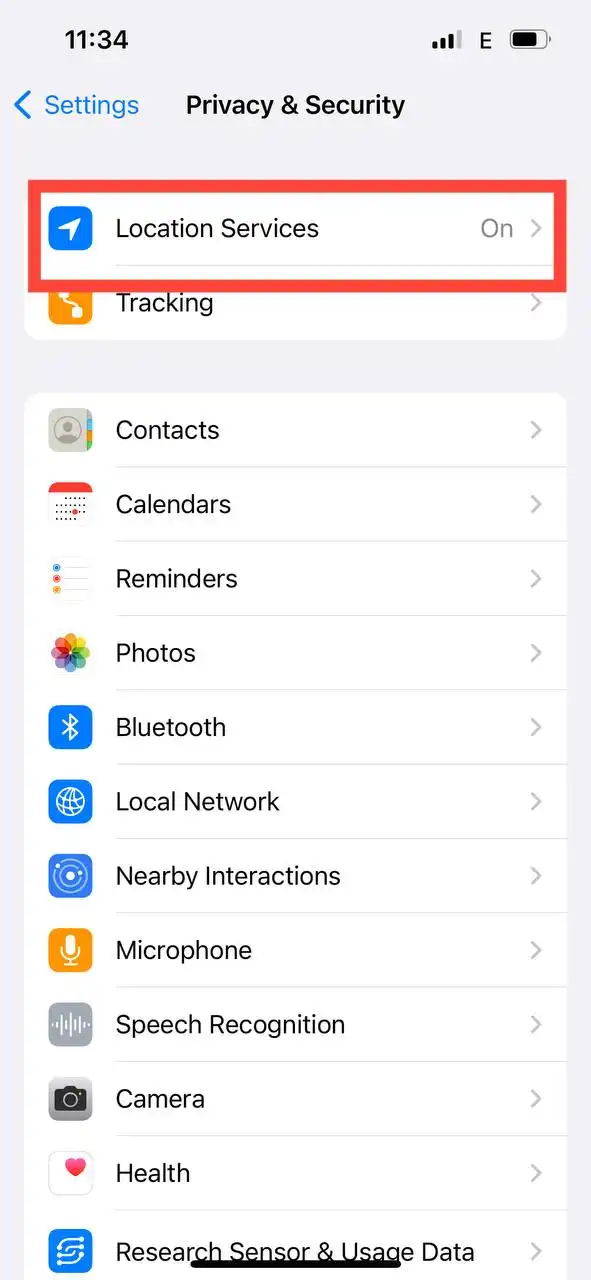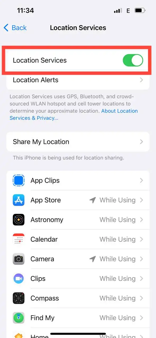 ۴- بر روی Location Services کلیک کنید تا روشن شود.