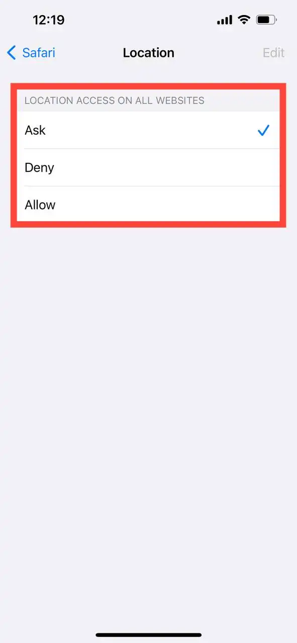 4- در این مرحله میتوانید نوع دستری مرورگر Safari را به Location تلفن همراه خود مشخص کنید.