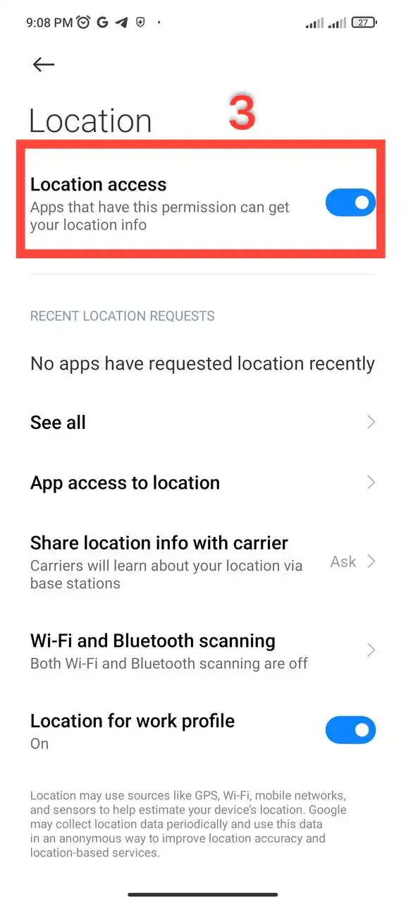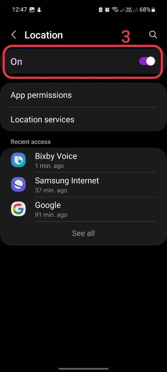 6- حال با استفاده از Location (موقعیت) در این منو، اجازه دسترسی را فعال کنید.