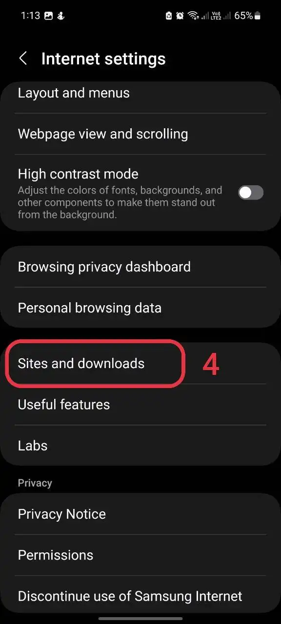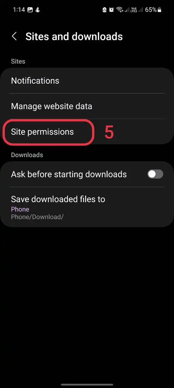 4- سپس بر روی Sites and downloads (سایت ها و دانلود ها) کلیک کنید.