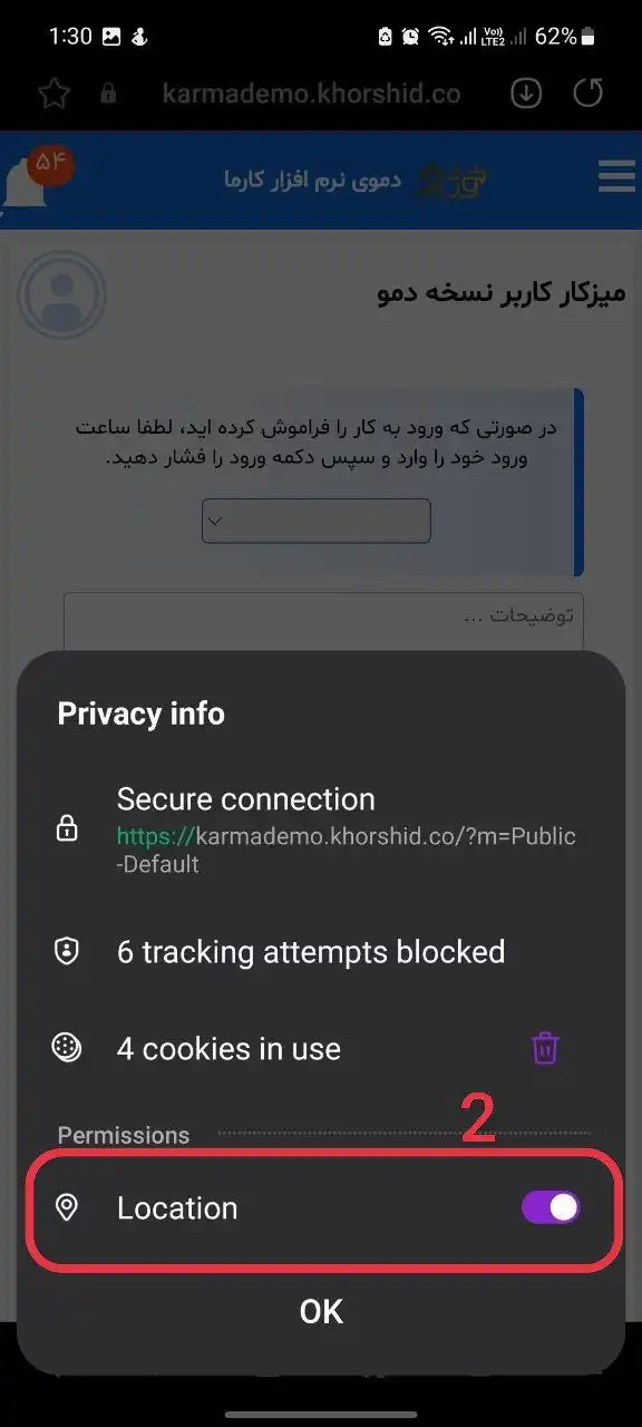 2- بر روی نماد قفل در بالا صفحه سمت چپ کلیک کرده و می توانید منو باز شده در شکل زیر را مشاهده کنید و از این قسمت اجازه دسترسی به لوکیشن (موقعیت) را بدهید.