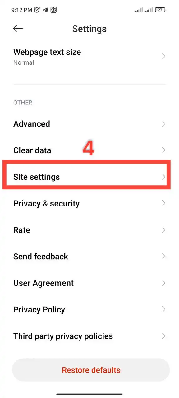 4- سپس بر روی Site settings (تنظیمات سایت ها) کلیک کنید.