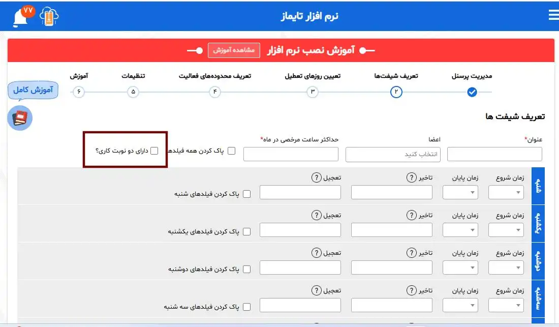 شما این امکان را دارید که ساعت کاریهای دو شیفتی را به سادگی تعریف کنید. برای این کار کافی است در بخش تعریف شیفت، گزینه “دو نوبت کاری” را فعال نمایید. با این اقدام، سیستم به شما این امکان را میدهد که برای هر شیفت ساعت های کاری متفاوتی را تنظیم کنید و کارمندان خود را بهطور مؤثرتر مدیریت نمایید.